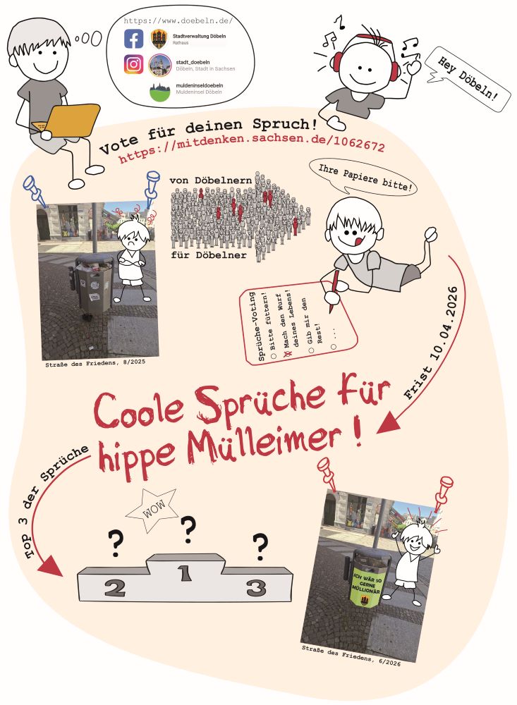 Die Döbelner sind aufgerufen bis zum 10.04.2026 aus einer Auswahl an Sprüchen ihre 5 Favoriten zu benennen.