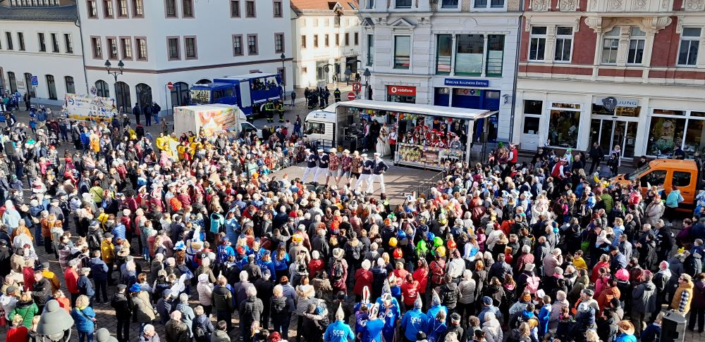 Zahlreiche Döbelnerinnen und Döbelner verfolgten im vergangenen Jahr das närrische Programm zur Rosenmontagsparty auf dem Obermarkt. Tradition hat auch der anschließende Rosenmontagsumzug durch die Innenstadt. Knapp 20 aufwendig geschmückte Wagen und sieben PKW ziehen dabei über die Muldeninsel. (Foto: Maria Fricke)