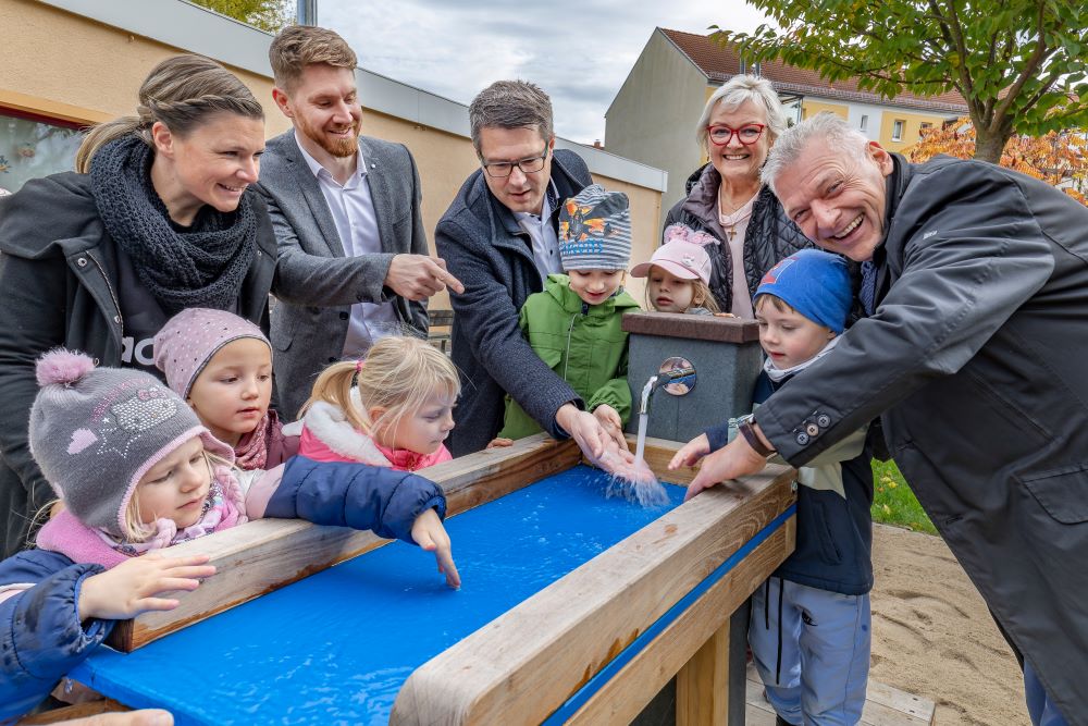 „Wasser marsch!“ hieß es am Montag, 20. Oktober 2025, im Außengelände der Kita „Sonnenschein“ in Döbeln-Ost I. Gemeinsam mit den Kindern nahmen Kita-Leiterin Anja Harnack (v. l.), Gerhard Kimmel von der Zentrale der Deutschen Vermögensberatung (DVAG) aus Frankfurt, Oberbürgermeister Sven Liebhauser sowie Katrin Kressler-Schmidt und Michael Schmidt, Leiter der Döbelner Direktion der DVAG, die neue Wasserspielanlage in Betrieb. (Foto: Lutz Weidler)