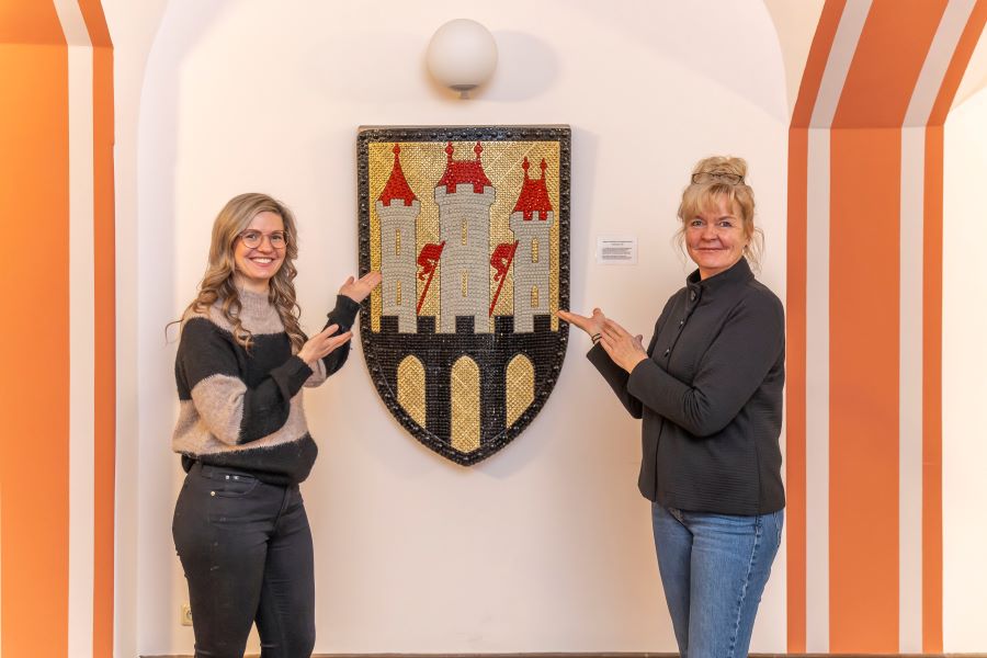 Ähnlich wie das Nagelwappen von 1916 soll das Stadtwappen aus 30.000 Klemmbausteinen aussehen, das in den Winterferien in einer Baumeisteraktion im Döbelner Stadtmuseum bei Kathrin Fuchs (rechts) entstehen soll. Die Idee dazu hatten Stefanie Leuschner (links) sowie Emmy Portig vom Organisationsteam des Festumzuges zum diesjährigen Heimatfest.