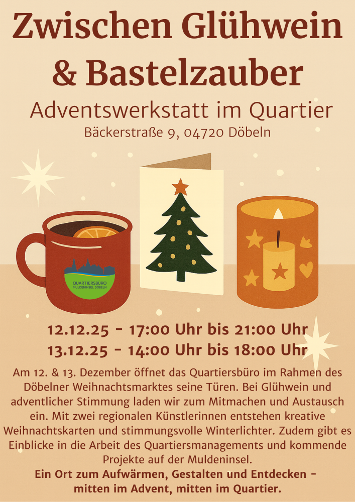 Im Rahmen des Döbelner Weihnachtsmarktes öffnet das Quartiersbüro auf der Muldeninsel seine Türen. Bei Glühwein und adventlicher Atmosphäre laden wir zum Mitmachen und Austausch ein.