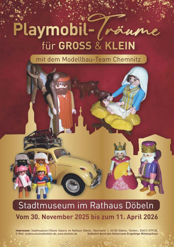 So stellt das Modellbau-Team Chemnitz in der Sonderausstellung „Playmobil-Träume für Groß und Klein“ im Döbelner Rathaus Playmobil-Welten aus. Ob Märchen-, Film- , aktuelle oder historische Szenen, die Playmobil-Figuren mit ihrem Lächeln im Gesicht sind vielseitig unterwegs und können eine Menge Geschichten erzählen.