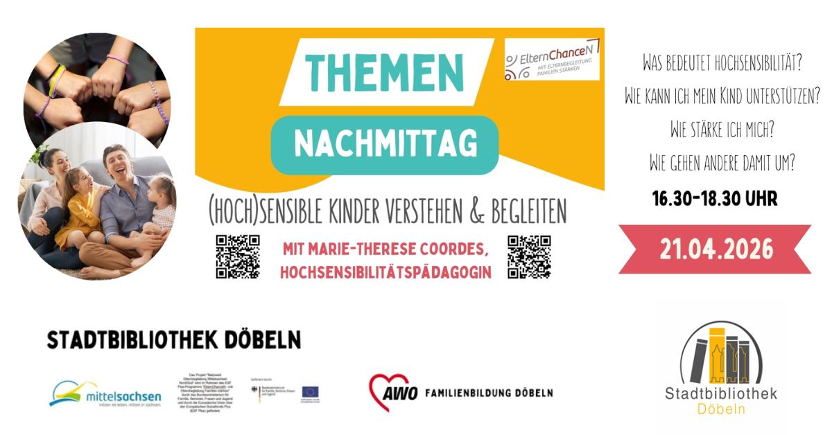 Zusammen mit der zertifizierten Hochsensibilitätspädagogin Marie – Therese Coordes bieten wir Unterstützung an. Sie hat ihr Fachwissen durch eine entsprechende Ausbildung am Institut für Hochsensibilität erhalten. Die Veranstaltung für Eltern und Fachkräfte findet am 21.04.2026 um 16:30 Uhr in der Stadtbibliothek Döbeln statt. Sie bietet fundierte Informationen und lädt zum Austausch ein. Eine parallele Kinderbetreuung in der Bibliothek ist möglich.